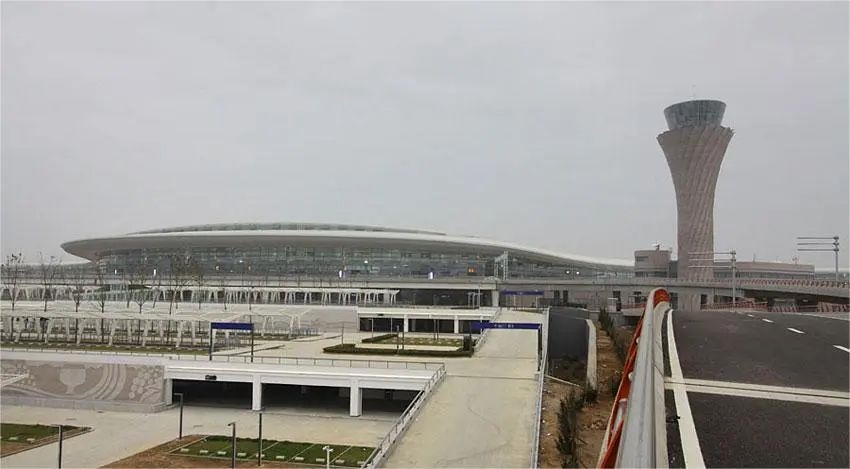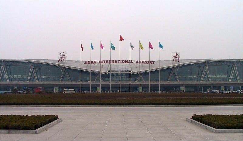 En viktig 4e-nivå internasjonal gateway 30 km fra sentrum. Fase II -utvidelsen omfatter flyplassanlegg, flytrafikkontroll, drivstoffforsyning og baser for Shandong Airlines og China Eastern Airlines.