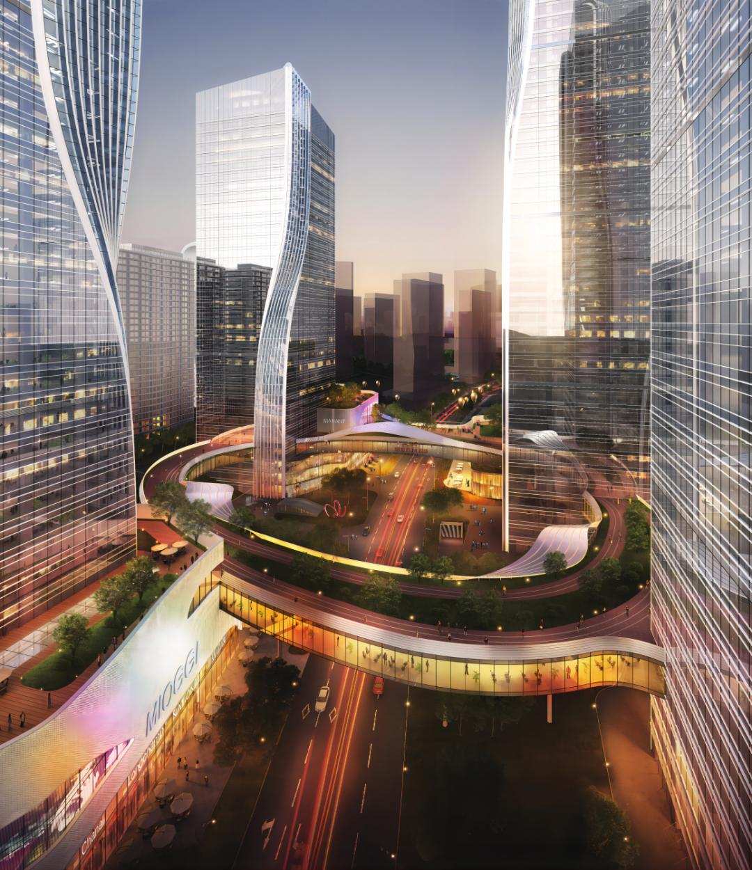 Dette tvillingtårnkomplekset dekker 57 dekar med et totalt gulvareal på 220 000 kvm, og integrerer kontorer, hoteller, detaljhandel, servering og underholdning. Glass gardinvegger, utsmykket med over 7200 meter synkroniserte lysstrimler, skaper dynamiske mønstre over nesten 11 000 kvm, og gir en kraftig visuell innvirkning.