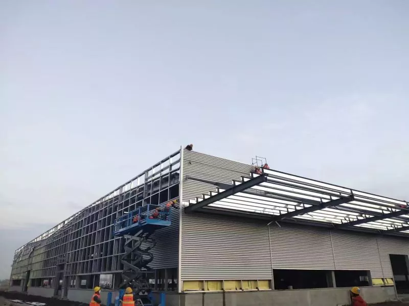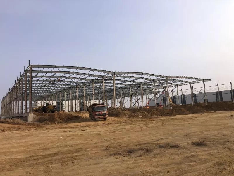 Portalrammen til lageret har en serie stålsøyler og sperrer som danner et stivt og stabilt rammeverk. Denne designen gir utmerket bærende kapasitet, og sikrer at lageret trygt kan støtte tunge belastninger og tåle ekstreme værforhold. Stålkomponentene er typisk prefabrikkert og samlet på stedet, reduserer konstruksjonstiden og sikrer presisjon i den endelige strukturen.
