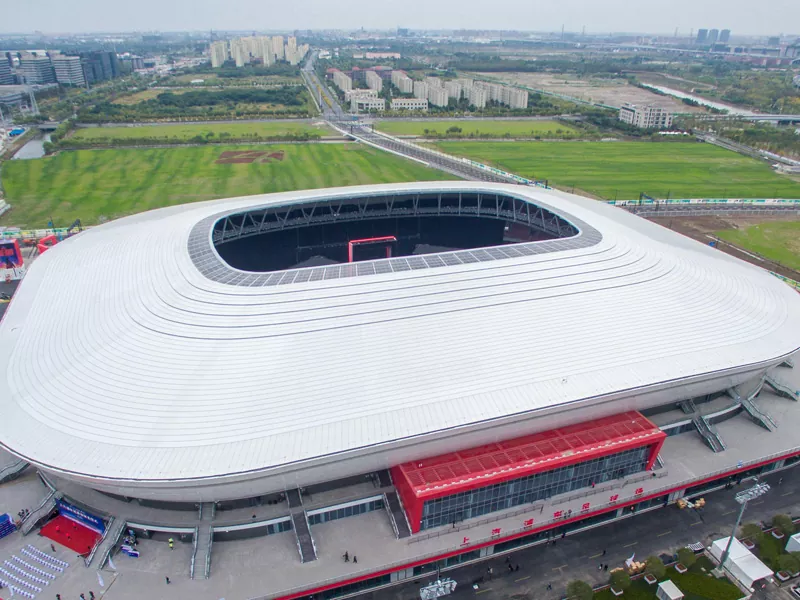 Toppen er vanligvis dekket med lette metallark eller gjennomskinnelige membranmaterialer, som ikke bare sikrer strukturen i strukturen, men også tar hensyn til kravene til estetikk og belysning. Gjennom teknologier som nettstrukturer og takstoler oppnår den en stor spenn-kolonnefri romdesign, noe som gir fleksibel utforming inne i arenaen og gir en åpen og uhindret utsikt for publikum.